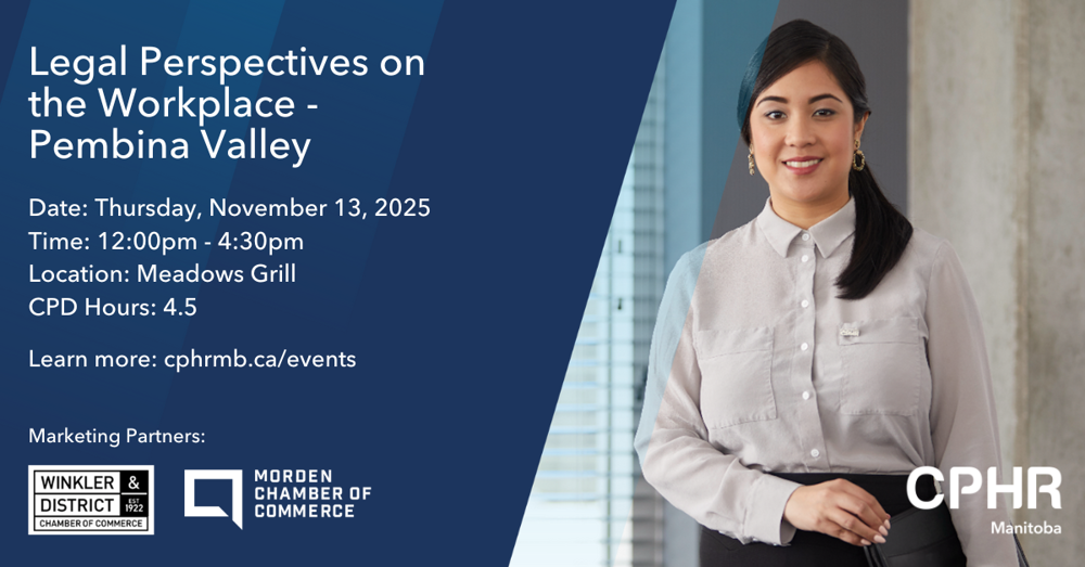 Join CPHR Manitoba's Pembina Valley Chapter for this informative legal workshop! Legal Perspectives on the Workplace:Managing Employment Agreements, Workplace Recordings, and Medical DocumentationDescription:In this session, MLT Aikins LLP Labour & Employment Team will cover best practices for starting the employment relationship, including the timing and content of offer letters and employment agreements. It will also address legal considerations around employees recording in the workplace and employer rights regarding medical documentation when employees are absent due to illness or injury. Participants will gain case law updates and practical takeaways to apply in their organizations. Agenda:12:00pm - 12:30pm Registration & lunch12:30pm - 4:30pm SessionsCPD hours: 4.5 Cost (add GST): MembersEarly Bird (until Oct. 24th) - $195.00Regular - $245.00 Non-MembersEarly Bird (until Oct. 24th ) - $270.00Regular - $320.00Registration includes: LunchPresentations/handouts: Digital copies of the presentation will be provided to all registered delegates ahead of the event (via email). Hard copies will not be provided.Event Cancellation Policy: This event falls under our general Professional Development Cancellation, Refund & Transfer Policy.Sign up for the workshop https://www.cphrmb.ca/events/register.aspx?id=1994678&itemid=4e2a363f-5fdf-4367-bf7a-4cc6774f64c2